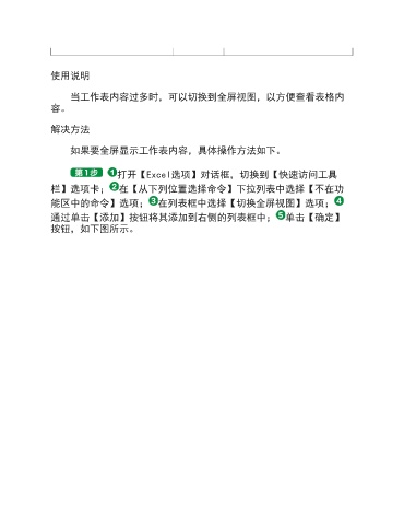 使用说明 当工作表内容过多时,可以切换到全屏视图,以方便查看表格内 容。 解决方法 如果要全屏显示工作表内容,具体操作方法如下。 打开【Excel选项】对话框,切换到【快速访问工具 栏】选项卡; 在【从下列位置选择命令】下拉列表中选择【不在功 能区中的命令】选项; 在列表框中选择【切换全屏视图】选项; 通过单击【添加】按钮将其添加到右侧的列表框中; 单击【确定】 按钮,如下图所示。