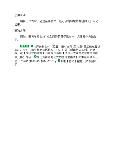使用说明 编辑工作表时,通过条件格式,还可以将特定年龄段的人员标记 出来。 解决方法 例如,要将年龄在25~32之间的职员标记出来,具体操作方法如 下。 打开素材文件(位置:素材文件\第13章\员工信息登记 表2.xlsx),选中单元格区域A3:H17,打开【新建格式规则】对话 框,在【选择规则类型】列表框中选择【使用公式确定要设置格式的 单元格】选项; 在【为符合此公式的值设置格式】文本框中输入公 式:“=AND($G3>=25,$G3<=32)”; 单击【格式】按钮,如下图所 示。
