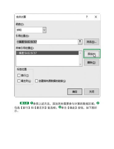 参照上述方法,添加其他需要参与计算的数据区域; 勾选【首行】和【最左列】复选框; 单击【确定】按钮,如下图所 示。