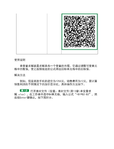 使用说明 单变量求解就是求解具有一个变量的方程,它通过调整可变单元 格中的数值,使之按照给定的公式得出目标单元格中的目标值。 解决方法 例如,假设某款手机的进价为1250元,销售费用为12元,要计算 销售利润在不同情况下的加价百分比,具体操作方法如下。 打开素材文件(位置:素材文件\第13章\单变量求 解.xlsx),在工作表中选中B4单元格,输入公式“=B1*B2-B3”,然 后按Enter键确认,如下图所示。