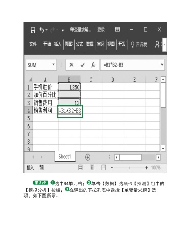 选中B4单元格; 单击【数据】选项卡【预测】组中的 【模拟分析】按钮; 在弹出的下拉列表中选择【单变量求解】选 项,如下图所示。
