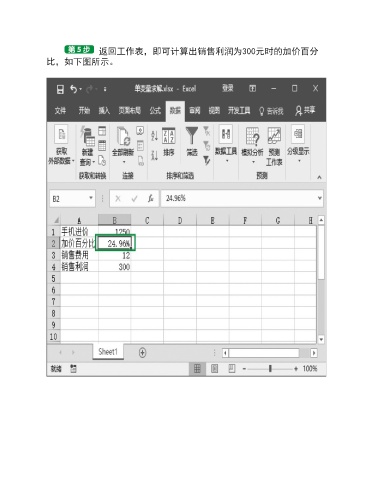 返回工作表,即可计算出销售利润为300元时的加价百分 比,如下图所示。