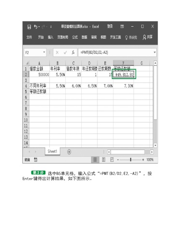 选中B5单元格,输入公式“=PMT(B2/D2,E2,-A2)”,按 Enter键得出计算结果,如下图所示。