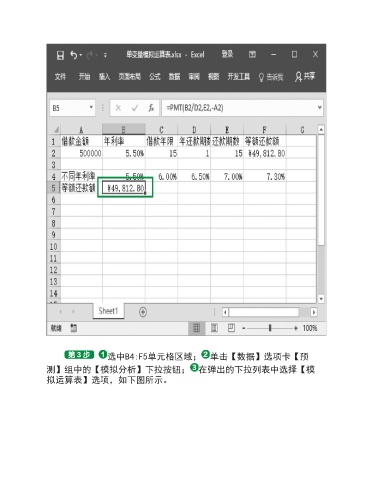 选中B4:F5单元格区域; 单击【数据】选项卡【预 测】组中的【模拟分析】下拉按钮; 在弹出的下拉列表中选择【模 拟运算表】选项,如下图所示。