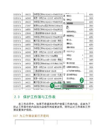 2.3 保护工作簿与工作表 在工作应用中,如果不希望其他用户查看工作表内容,或者为了 防止工作表中的内容因为误操作而被更改等,则可以对工作表和工作 簿设置保护措施。 037 为工作簿设置打开密码