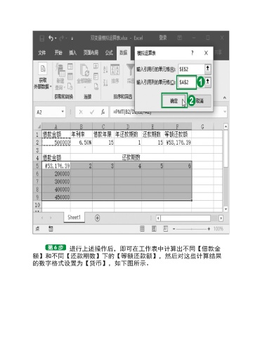 进行上述操作后,即可在工作表中计算出不同【借款金 额】和不同【还款期数】下的【等额还款额】,然后对这些计算结果 的数字格式设置为【货币】,如下图所示。