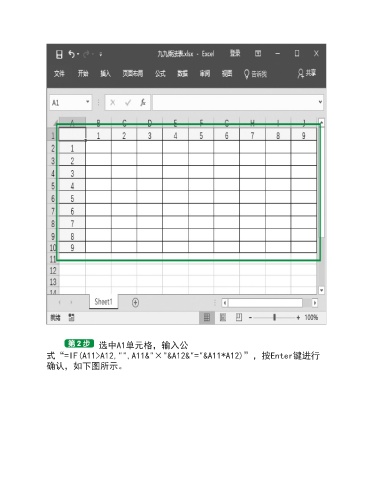 选中A1单元格,输入公 式“=IF(A11>A12,"",A11&"×"&A12&"="&A11*A12)”,按Enter键进行 确认,如下图所示。