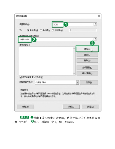 弹出【添加约束】对话框,将单元格B2的约束条件设置 为“<=30”; 单击【添加】按钮,如下图所示。