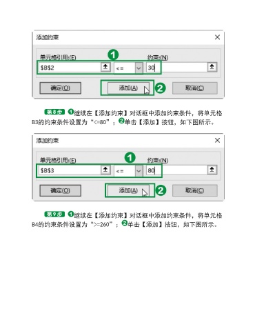 继续在【添加约束】对话框中添加约束条件,将单元格 B3的约束条件设置为“<=80”; 单击【添加】按钮,如下图所示。 继续在【添加约束】对话框中添加约束条件,将单元格 B4的约束条件设置为“>=260”; 单击【添加】按钮,如下图所示。