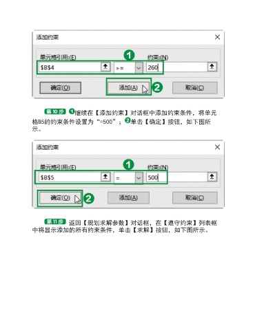 继续在【添加约束】对话框中添加约束条件,将单元 格B5的约束条件设置为“=500”; 单击【确定】按钮,如下图所 示。 返回【规划求解参数】对话框,在【遵守约束】列表框 中将显示添加的所有约束条件,单击【求解】按钮,如下图所示。