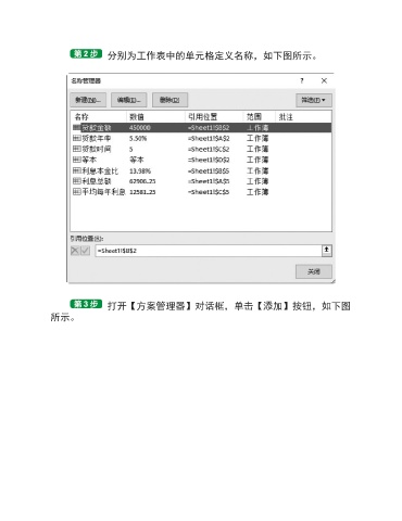 分别为工作表中的单元格定义名称,如下图所示。 打开【方案管理器】对话框,单击【添加】按钮,如下图 所示。