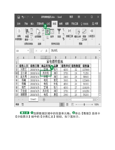 选择数据区域中的任意单元格; 单击【数据】选项卡 【分级显示】组中的【分类汇总】按钮,如下图所示。