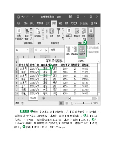 弹出【分类汇总】对话框,在【分类字段】下拉列表中 选择要进行分类汇总的字段,本例中选择【商品类别】; 在【汇总 方式】下拉列表中选择需要的汇总方式,本例中选择【求和】; 在 【选定汇总项】列表框中选择要进行汇总的项目,本例中选择【销售 额】; 单击【确定】按钮,如下图所示。