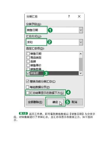 返回工作表,即可看到表格数据以【销售日期】为分类字 段,对销售额进行了求和汇总,且汇总项显示在数据上方,如下图所 示。