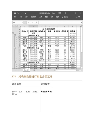 374 对表格数据进行嵌套分类汇总 适用版本 实用指数 Excel 2007、2010、2013、 ★★★★★ 2016