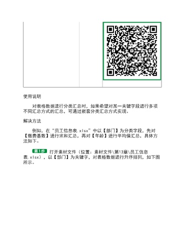 使用说明 对表格数据进行分类汇总时,如果希望对某一关键字段进行多项 不同汇总方式的汇总,可通过嵌套分类汇总方式实现。 解决方法 例如,在“员工信息表.xlsx”中以【部门】为分类字段,先对 【缴费基数】进行求和汇总,再对【年龄】进行平均值汇总,具体方 法如下。 打开素材文件(位置:素材文件\第13章\员工信息 表.xlsx),以【部门】为关键字,对表格数据进行升序排列,如下图 所示。