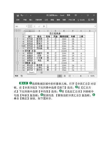 选择数据区域中的任意单元格,打开【分类汇总】对话 框,在【分类字段】下拉列表中选择【部门】选项; 在【汇总方 式】下拉列表中选择【平均值】选项; 在【选定汇总项】列表框中 勾选【年龄】复选框; 取消勾选 【替换当前分类汇总】复选框; 单击【确定】按钮,如下图所示。