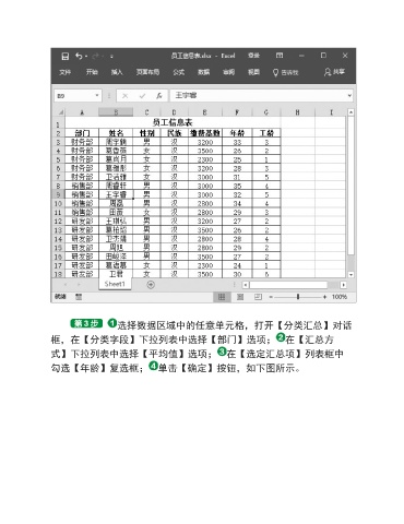 选择数据区域中的任意单元格,打开【分类汇总】对话 框,在【分类字段】下拉列表中选择【部门】选项; 在【汇总方 式】下拉列表中选择【平均值】选项; 在【选定汇总项】列表框中 勾选【年龄】复选框; 单击【确定】按钮,如下图所示。