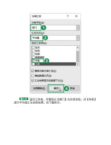 返回工作表,可看到以【部门】为分类字段,对【年龄】 进行平均值汇总后的效果,如下图所示。