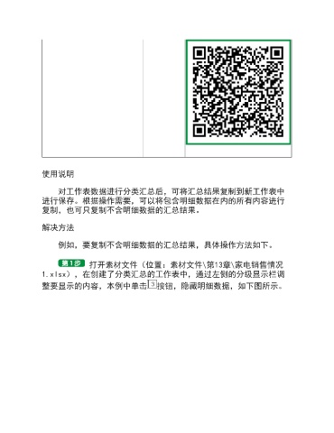 使用说明 对工作表数据进行分类汇总后,可将汇总结果复制到新工作表中 进行保存。根据操作需要,可以将包含明细数据在内的所有内容进行 复制,也可只复制不含明细数据的汇总结果。 解决方法 例如,要复制不含明细数据的汇总结果,具体操作方法如下。 打开素材文件(位置:素材文件\第13章\家电销售情况 1.xlsx),在创建了分类汇总的工作表中,通过左侧的分级显示栏调 整要显示的内容,本例中单击 按钮,隐藏明细数据,如下图所示。