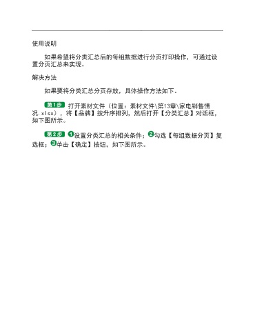 使用说明 如果希望将分类汇总后的每组数据进行分页打印操作,可通过设 置分页汇总来实现。 解决方法 如果要将分类汇总分页存放,具体操作方法如下。 打开素材文件(位置:素材文件\第13章\家电销售情 况.xlsx),将【品牌】按升序排列,然后打开【分类汇总】对话框, 如下图所示。 设置分类汇总的相关条件; 勾选【每组数据分页】复 选框; 单击【确定】按钮,如下图所示。