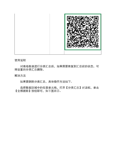 使用说明 对表格数据进行分类汇总后,如果需要恢复到汇总前的状态,可 将设置的分类汇总删除。 解决方法 如果要删除分类汇总,具体操作方法如下。 选择数据区域中的任意单元格,打开【分类汇总】对话框,单击 【全部删除】按钮即可,如下图所示。