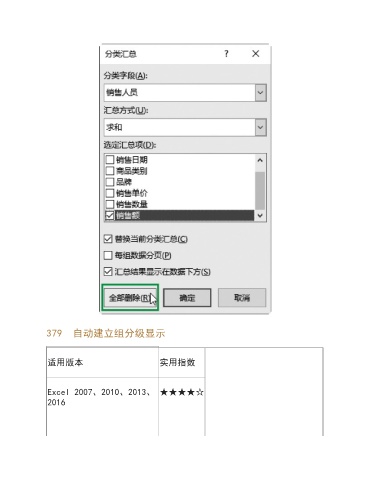 379 自动建立组分级显示 适用版本 实用指数 Excel 2007、2010、2013、 ★★★★☆ 2016