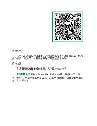 使用说明 对表格数据建立分级显示,其的目就是为了方便查看数据,根据 操作需要,用户可以对明细数据进行隐藏或显示操作。 解决方法 如果要隐藏或显示明细数据,具体操作方法如下。 打开素材文件(位置:素材文件\第13章\资产类科目 表.xlsx),单击分级显示按钮 ,只显示1级数据,隐藏所有明细数 据,如下图所示。
