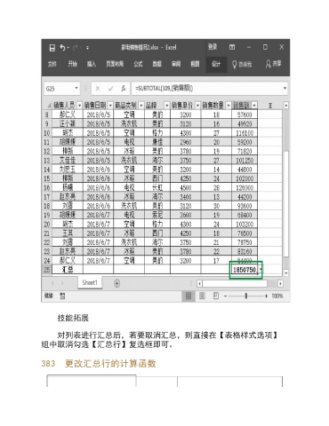 技能拓展 对列表进行汇总后,若要取消汇总,则直接在【表格样式选项】 组中取消勾选【汇总行】复选框即可。 383 更改汇总行的计算函数