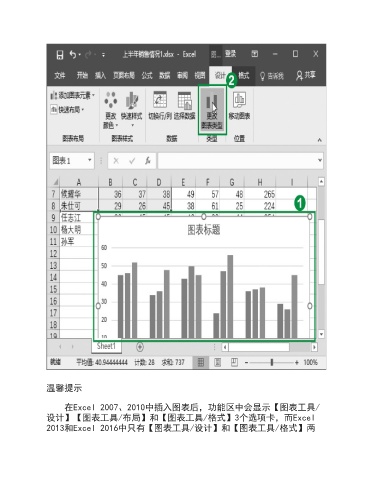 温馨提示 在Excel 2007、2010中插入图表后,功能区中会显示【图表工具/ 设计】【图表工具/布局】和【图表工具/格式】3个选项卡,而Excel 2013和Excel 2016中只有【图表工具/设计】和【图表工具/格式】两
