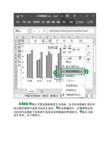 弹出【更改图表类型】对话框,在【所有图表】选项卡 的左侧列表框中选择【组合】选项; 在右侧窗格中,在需要更改样 式的系列右侧的下拉列表中选择该系列数据的图表样式; 单击【确 定】按钮,如下图所示。