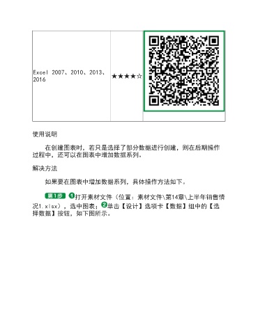 Excel 2007、2010、2013、 2016 ★★★★☆ 使用说明 在创建图表时,若只是选择了部分数据进行创建,则在后期操作 过程中,还可以在图表中增加数据系列。 解决方法 如果要在图表中增加数据系列,具体操作方法如下。 打开素材文件(位置:素材文件\第14章\上半年销售情 况1.xlsx),选中图表; 单击【设计】选项卡【数据】组中的【选 择数据】按钮,如下图所示。