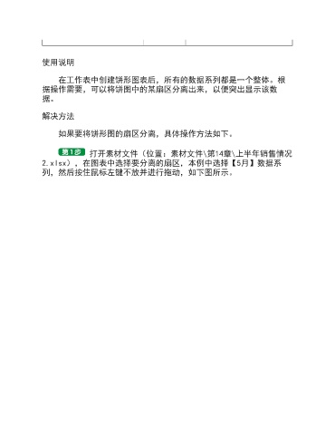 使用说明 在工作表中创建饼形图表后,所有的数据系列都是一个整体。根 据操作需要,可以将饼图中的某扇区分离出来,以便突出显示该数 据。 解决方法 如果要将饼形图的扇区分离,具体操作方法如下。 打开素材文件(位置:素材文件\第14章\上半年销售情况 2.xlsx),在图表中选择要分离的扇区,本例中选择【5月】数据系 列,然后按住鼠标左键不放并进行拖动,如下图所示。