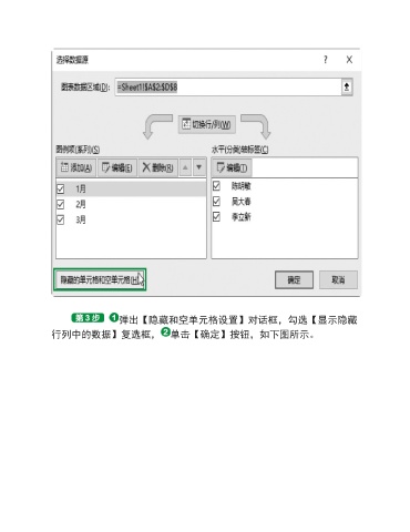 弹出【隐藏和空单元格设置】对话框,勾选【显示隐藏 行列中的数据】复选框, 单击【确定】按钮,如下图所示。
