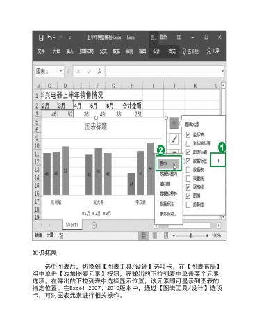 知识拓展 选中图表后,切换到【图表工具/设计】选项卡,在【图表布局】 组中单击【添加图表元素】按钮,在弹出的下拉列表中单击某个元素 选项,在弹出的下拉列表中选择显示位置,该元素即可显示到图表的 指定位置。在Excel 2007、2010版本中,通过【图表工具/设计】选项 卡,可对图表元素进行相关操作。