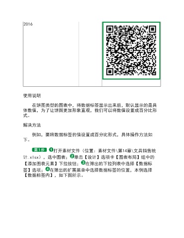 2016 使用说明 在饼图类型的图表中,将数据标签显示出来后,默认显示的是具 体数值,为了让饼图更加形象直观,我们可以将数值设置成百分比形 式。 解决方法 例如,要将数据标签的值设置成百分比形式,具体操作方法如 下。 打开素材文件(位置:素材文件\第14章\文具销售统 计.xlsx),选中图表; 单击【设计】选项卡【图表布局】组中的 【添加图表元素】下拉按钮; 在弹出的下拉列表中选择【数据标 签】选项; 在弹出的扩展菜单中选择数据标签的位置,本例选择 【数据标签内】,如下图所示。