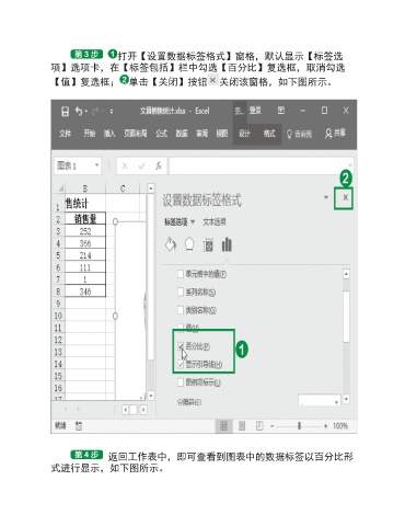 打开【设置数据标签格式】窗格,默认显示【标签选 项】选项卡,在【标签包括】栏中勾选【百分比】复选框,取消勾选 【值】复选框; 单击【关闭】按钮 关闭该窗格,如下图所示。 返回工作表中,即可查看到图表中的数据标签以百分比形 式进行显示,如下图所示。