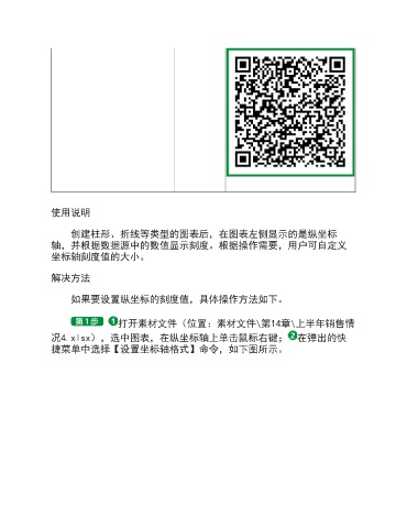 使用说明 创建柱形、折线等类型的图表后,在图表左侧显示的是纵坐标 轴,并根据数据源中的数值显示刻度。根据操作需要,用户可自定义 坐标轴刻度值的大小。 解决方法 如果要设置纵坐标的刻度值,具体操作方法如下。 打开素材文件(位置:素材文件\第14章\上半年销售情 况4.xlsx),选中图表,在纵坐标轴上单击鼠标右键; 在弹出的快 捷菜单中选择【设置坐标轴格式】命令,如下图所示。