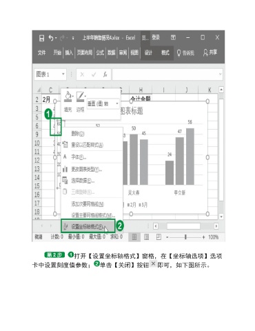 打开【设置坐标轴格式】窗格,在【坐标轴选项】选项 卡中设置刻度值参数; 单击【关闭】按钮 即可,如下图所示。