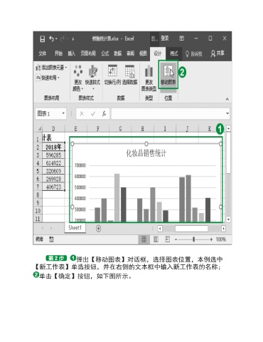 弹出【移动图表】对话框,选择图表位置,本例选中 【新工作表】单选按钮,并在右侧的文本框中输入新工作表的名称; 单击【确定】按钮,如下图所示。