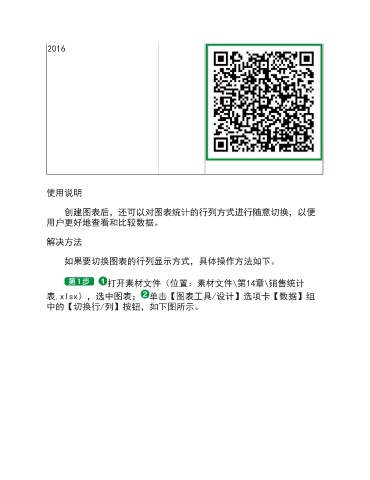 2016 使用说明 创建图表后,还可以对图表统计的行列方式进行随意切换,以便 用户更好地查看和比较数据。 解决方法 如果要切换图表的行列显示方式,具体操作方法如下。 打开素材文件(位置:素材文件\第14章\销售统计 表.xlsx),选中图表; 单击【图表工具/设计】选项卡【数据】组 中的【切换行/列】按钮,如下图所示。