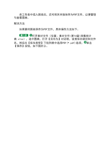 在工作表中插入图表后,还可将其单独保存为PDF文件,以便管理 与查看图表。 解决方法 如果要将图表保存为PDF文件,具体操作方法如下。 打开素材文件(位置:素材文件\第14章\销售统计 表.xlsx),选中图表,打开【另存为】对话框,设置保存路径和文件 名,然后在【保存类型】下拉列表中选择PDF(*.pdf)选项; 单击 【保存】按钮,如下图所示。