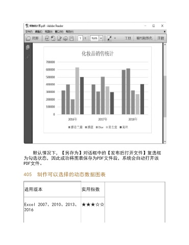 默认情况下,【另存为】对话框中的【发布后打开文件】复选框 为勾选状态,因此成功将图表保存为PDF文件后,系统会自动打开该 PDF文件。 405 制作可以选择的动态数据图表 适用版本 实用指数 Excel 2007、2010、2013、 ★★★☆☆ 2016