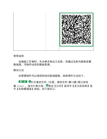 使用说明 在编辑工作表时,先为单元格定义名称,再通过名称为图表设置 数据源,可制作动态的数据图表。 解决方法 如果要制作可以选择的动态数据图表,具体操作方法如下。 打开素材文件(位置:素材文件\第14章\笔记本销 量.xlsx),选中A1单元格; 单击【公式】选项卡【定义的名称】组 中【名称管理器】按钮,如下图所示。