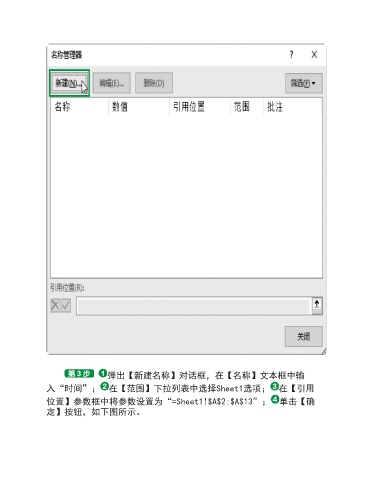 弹出【新建名称】对话框,在【名称】文本框中输 入“时间”; 在【范围】下拉列表中选择Sheet1选项; 在【引用 位置】参数框中将参数设置为“=Sheet1!$A$2:$A$13”; 单击【确 定】按钮,如下图所示。