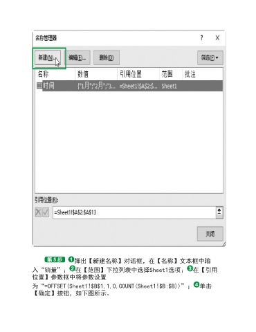 弹出【新建名称】对话框,在【名称】文本框中输 入“销量”; 在【范围】下拉列表中选择Sheet1选项; 在【引用 位置】参数框中将参数设置 为“=OFFSET(Sheet1!$B$1,1,0,COUNT(Sheet1!$B:$B))”; 单击 【确定】按钮,如下图所示。