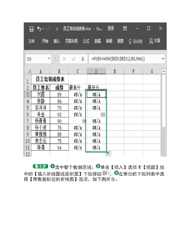选中整个数据区域; 单击【插入】选项卡【插图】组 中的【插入折线图或面积图】下拉按钮 ; 在弹出的下拉列表中选 择【带数据标记的折线图】选项,如下图所示。