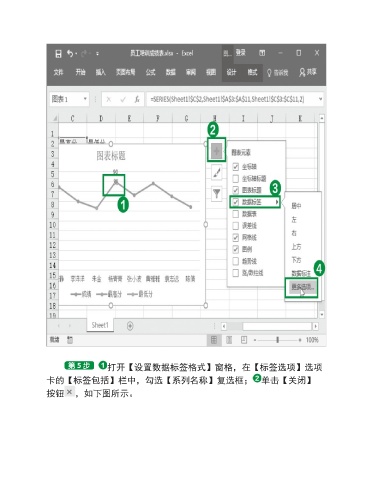 打开【设置数据标签格式】窗格,在【标签选项】选项 卡的【标签包括】栏中,勾选【系列名称】复选框; 单击【关闭】 按钮 ,如下图所示。