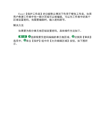 Excel【保护工作表】的功能默认情况下作用于整张工作表,如果 用户希望工作表中有一部分区域可以被编辑,可以为工作表中的某个 区域设置密码,当需要编辑时,输入密码即可。 解决方法 如果要为部分单元格区域设置密码,具体操作方法如下。 选择需要凭密码编辑的单元格区域; 切换到【审阅】 选项卡; 单击【保护】组中的【允许编辑区域】按钮,如下图所 示。