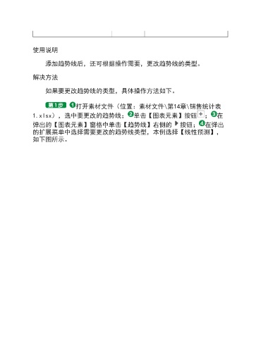 使用说明 添加趋势线后,还可根据操作需要,更改趋势线的类型。 解决方法 如果要更改趋势线的类型,具体操作方法如下。 打开素材文件(位置:素材文件\第14章\销售统计表 1.xlsx),选中要更改的趋势线; 单击【图表元素】按钮 ; 在 弹出的【图表元素】窗格中单击【趋势线】右侧的 按钮; 在弹出 的扩展菜单中选择需要更改的趋势线类型,本例选择【线性预测】, 如下图所示。